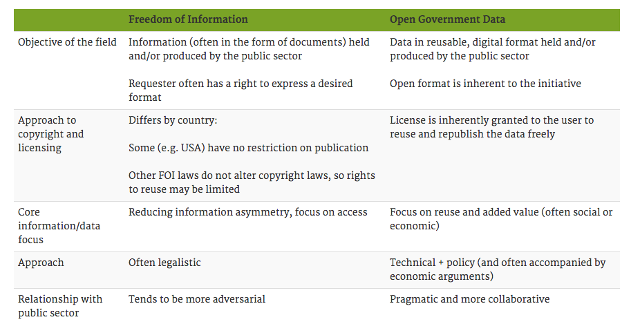 A: As a generalisation — because no one model fits all — the FOI community has mainly focused on the construction, enactment and operation of access to information laws, while OGD groups are dedicated to the reuse of disclosed data. The former fundamentally comes from a legal rights background, while the latter has generally stemmed from economic/commercial or technological environments. These differences partially explain the diverse approaches to their relationship with governments and, therefore, the differences in terms of political action.